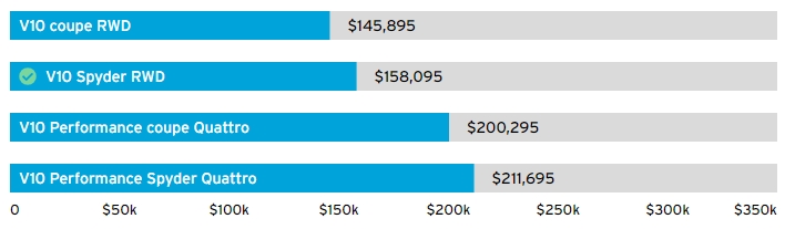 아우디 R8 은 기본 옵션인 V10 COUPE RWD는 532 마력에 후륜 구동을 도입했습니다. 562 마력에 4륜 구동은 더 비싸고 강력한 R8 Peroformance 모델로 올라가야 합니다. 아쉽게도 2월에 출시될 R8 페이스리프트 모델 중 스파이더 모델은 출시에서 제외된다고 합니다.