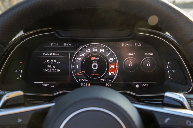 계기판을 인포테인먼트 화면으로 사용함으로써 단순한 레이아웃을 제공하며, 스포츠 시트와 D컷 스티어링 휠, 고해상도 디지털 게이지 클러스터가 R8의 운전석 중앙을 차지합니다. 내부 색상은 검정, 회색, 갈색 및 빨간색 가죽은 평면 또는 퀄트 패턴입니다.