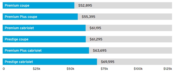 북미기준 Coupe 모델이 $ 52,895 부터 시작됩니다. 국내에선 이 중 카브리올레 모델을 제외하고 출시됩니다. Coupe 와 Sportback모델은 과연 한 가지 트림으로 나올지 아니면 북미처럼 세분화되어서 나올지는 지켜봐야 될 부분입니다. 가격은 Coupe 와 Sportback 모델이 크게 차이 나지 않을 것으로 예상됩니다. (북미의 경우 가격이 동일함)