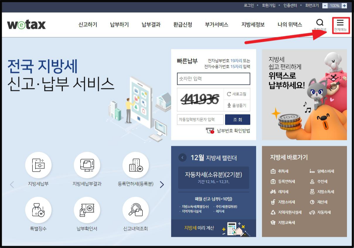 위택스 홈페이지 우측상단에 전체 메뉴를 클릭해서 전체 메뉴 화면으로 넘어갑니다.