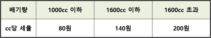 일반적인 승용차나 소형 승합차는 배기량에 비례하여 해당 배기량 등급에 해당하는 '세금액 X 배기량' 의 형태로 세액을 정하게 됩니다. 일반 자가용 차량은 세액이 높고 영업용은 매우 낮은 세율을 적용하는데, 자가용 승합차와 화물차는 65,000원 고정이며, 중형 택시 신차의 자동차세가 연간 4만 원을 넘지 않는 수준입니다. 일반인들이 자가용으로 사용하는 비영업용 승용차의 경우에는 아래 표와 같은 기준으로 세율이 적용됩니다.