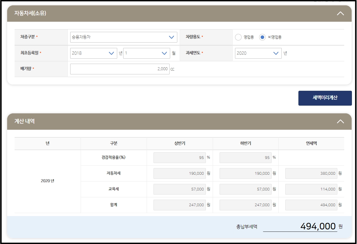 차종구분, 차량용도, 차량 최초 등록일, 과세연도, 배기량을 입력하시고 하단에 세액 미리 계산 버튼을 클릭합니다. 그러면 경감 적용률과 자동차세+교육세를 포함한 총 납부세액이 오른쪽 하단에 나오게 됩니다. 제 차는 494,000원이 총 납부세액으로 나왔습니다. 이 금액을 연납 신청하게 되면 10% 감면받아 444,600원을 납부하게 됩니다.