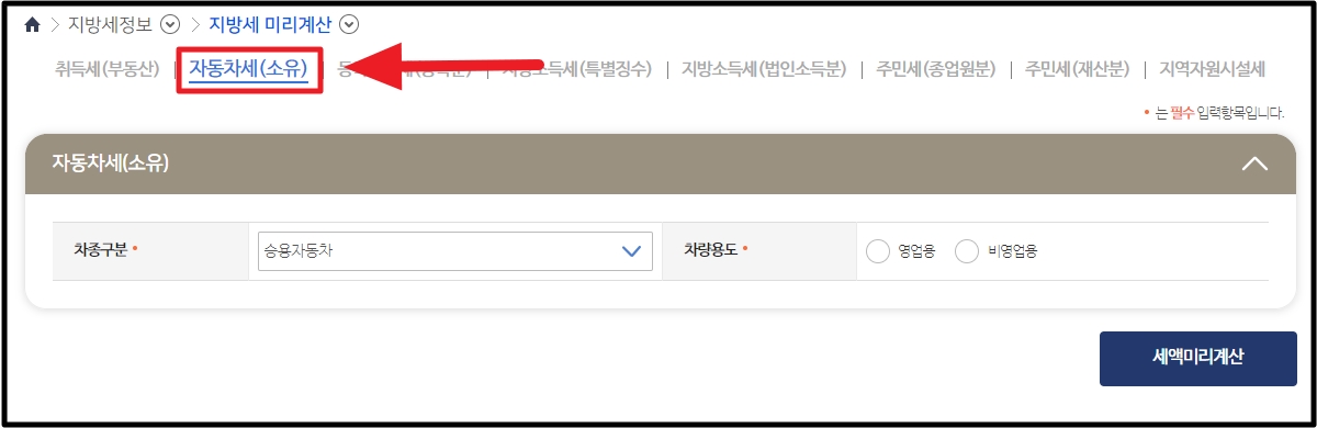 위택스 홈페이지에서 자동차세 조회 및 계산을 할 수 있습니다. (www.wetax.go.kr/main/)