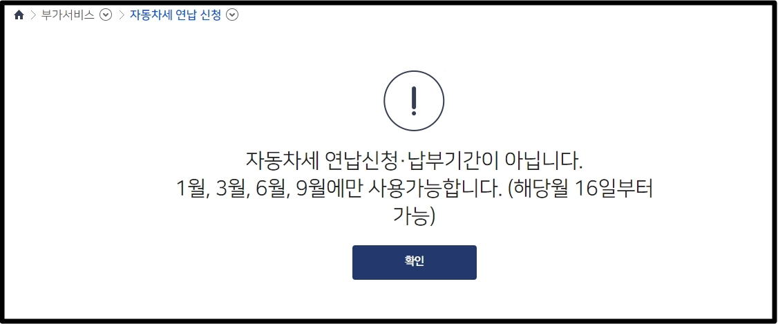 현재(2020년 12월 22일)는 자동차세 연납 신청·납부기간이 아니라, 1월 · 3월 · 6월 · 9월에만 신청이 가능하다고 합니다.